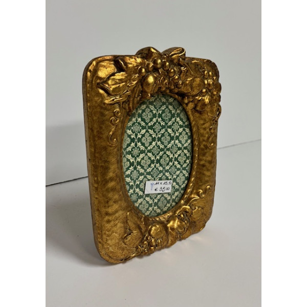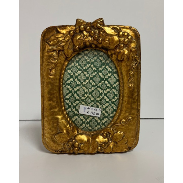 Porta foto in legno: oro foglia con fiocco e decori sia nella parte superiore che in quella inferiore. Interno ovale per foto di 15.5x11cm.