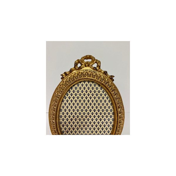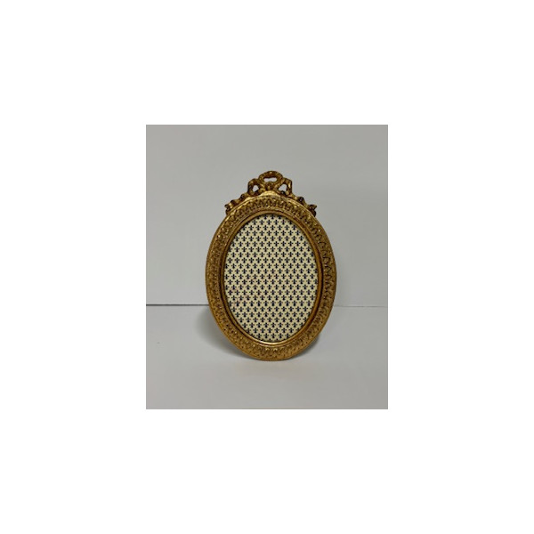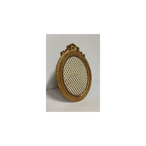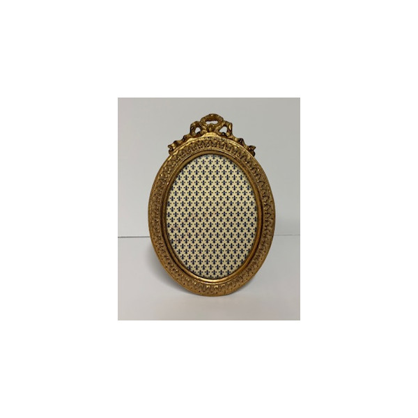 Porta foto ovale completamente lavorato e con fiocco. Doratura a foglia e invecchiatura sui rilievi e nella gola interna.