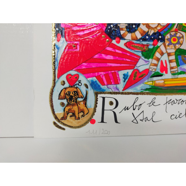 Serigrafia polimaterica a 35 colori con metallo in pressografica e foglia oro, misura 35x80 cm, esemplare n. 111 di 200. La serigrafia è corredata da certificato di garanzia.